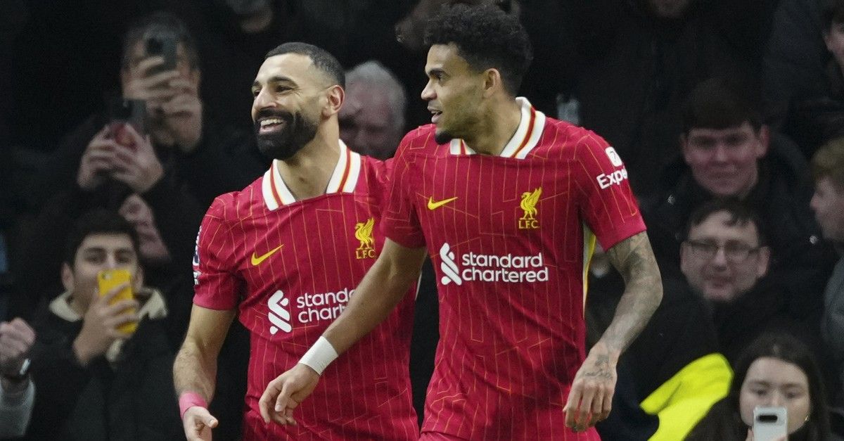 Liverpool’s Luis Diaz, right, celebrates with teammate Mohamed Salah after scoring his side’s sixth goal during the English Premier League soccer match between Tottenham and Liverpool at Tottenham Hotspur Stadium in London, Sunday, Dec. 22, 2024. (AP Photo/Dave Shopland)