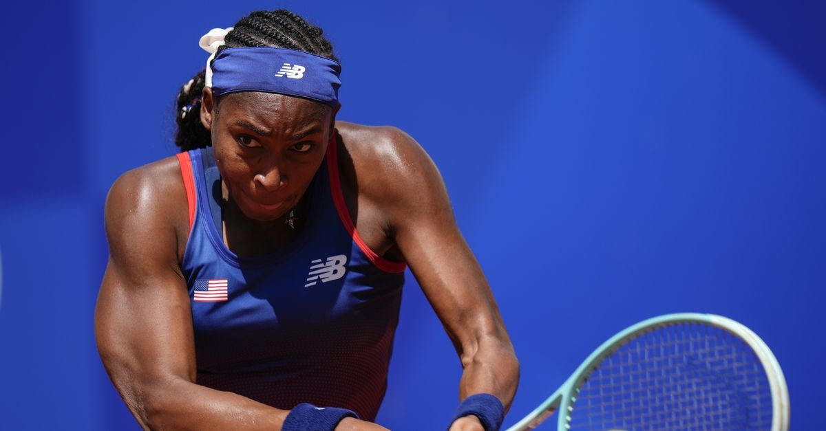 Coco Gauff of United States returns the ball against Maria Lourdes Carle of Argentina during the women’s singles tennis competition at the at the Roland Garros stadium, at the 2024 Summer Olympics, Monday, July 29, 2024, in Paris, France. (AP Photo/Manu Fernandez)