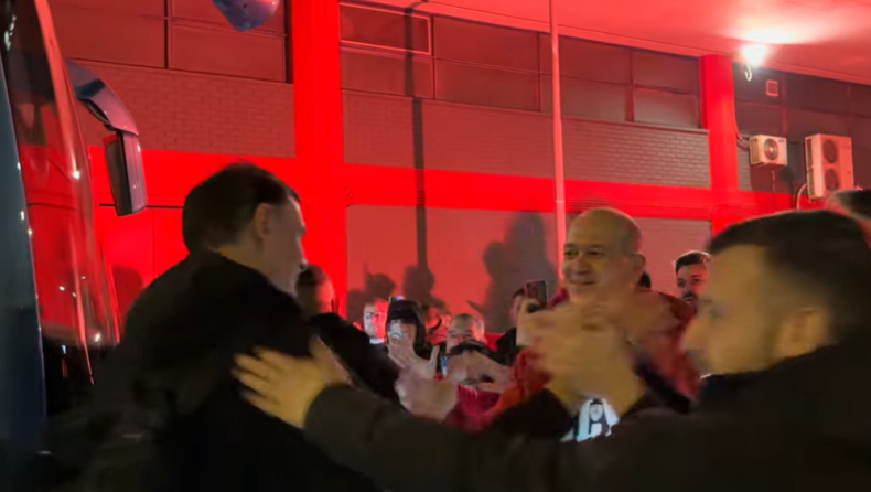 Μάλιστα, αρκετοί φίλοι των «ερυθρόλευκων» βρέθηκαν στο ΣΕΦ για να υποδεχτούν την αποστολή μετά από τη νίκη της και να την αποθεώσουν. Το «παρών» έδωσε και ο Γιώργος Αγγελόπουλος, ο οποίος χαιρέτησε έναν προς έναν τους παίκτες και τον προπονητή.