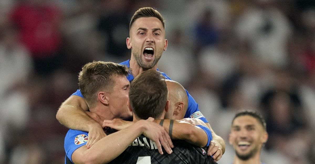 Οι παίκτες της Σλοβενίας πανηγυρίζουν την πρόκριση στους 16 του Euro 2024