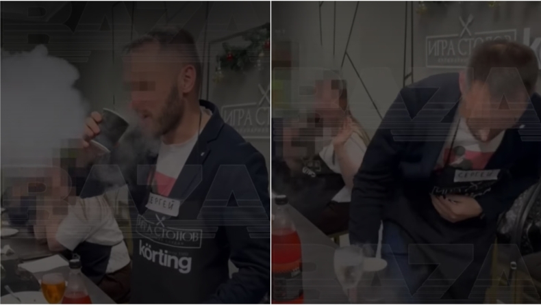 Σε βίντεο που έγινε viral, ο 38χρονος φαίνεται να παίρνει το ποτό του σε χάρτινο ποτήρι και να το πίνει σχεδόν αμέσως. Δευτερόλεπτα αργότερα, εκπνέει ατμούς αζώτου και διπλώνεται από τον πόνο.
